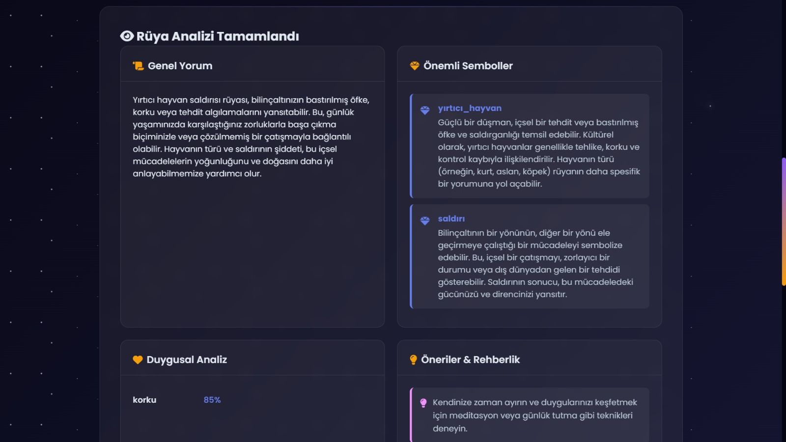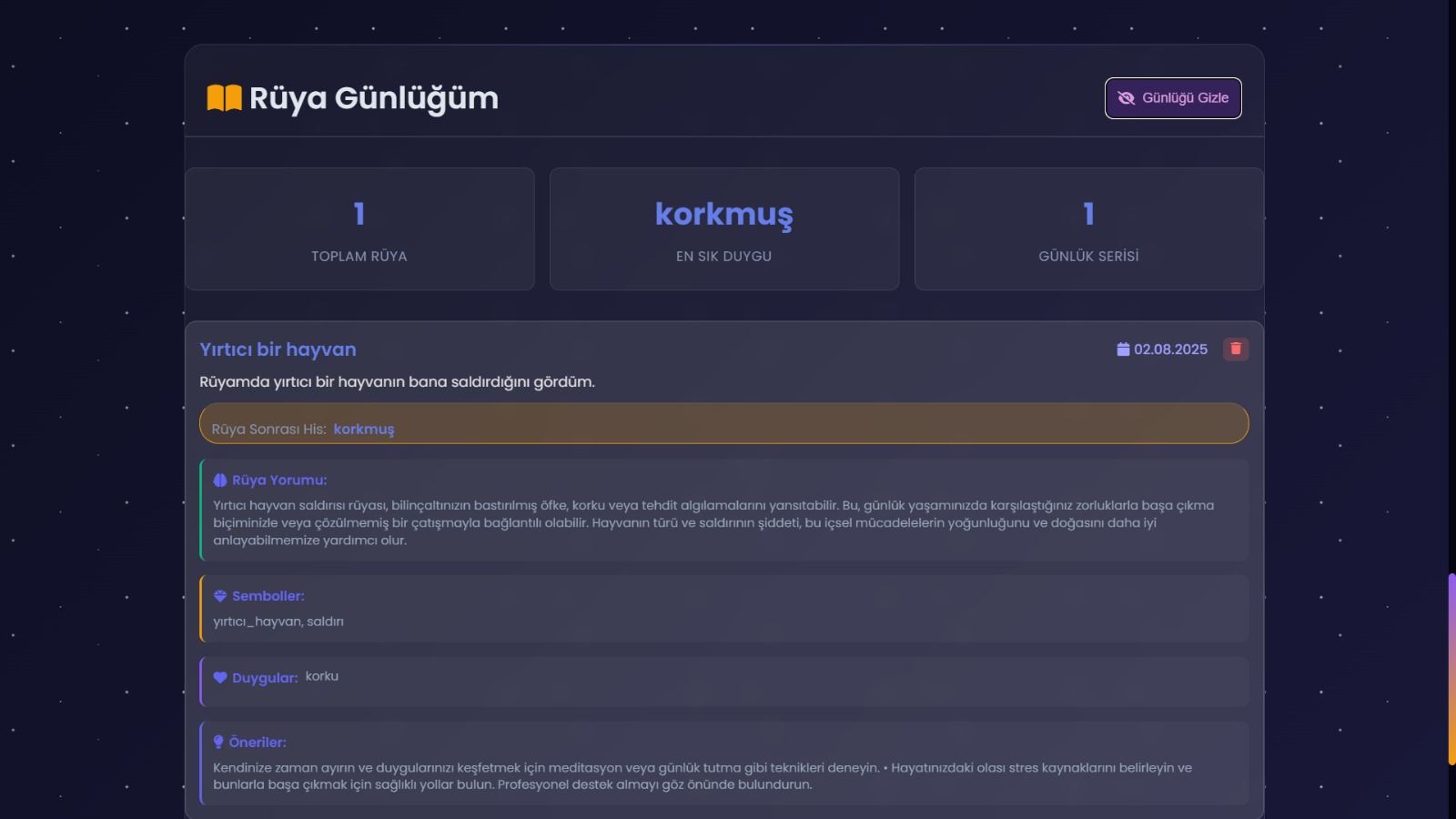 DreamAI, kullanıcıların rüyalarını detaylı bir şekilde kaydetmelerine ve yapay zeka algoritmaları kullanarak bu rüyaların psikolojik/sembolik analizini yapmalarına olanak tanıyan modern bir web uygulamasıdır. Kullanıcıların bilinçaltı verilerini anlamlandırmasına yardımcı olurken, aynı zamanda kişisel bir "Rüya Günlüğü" tutmalarını sağlar.